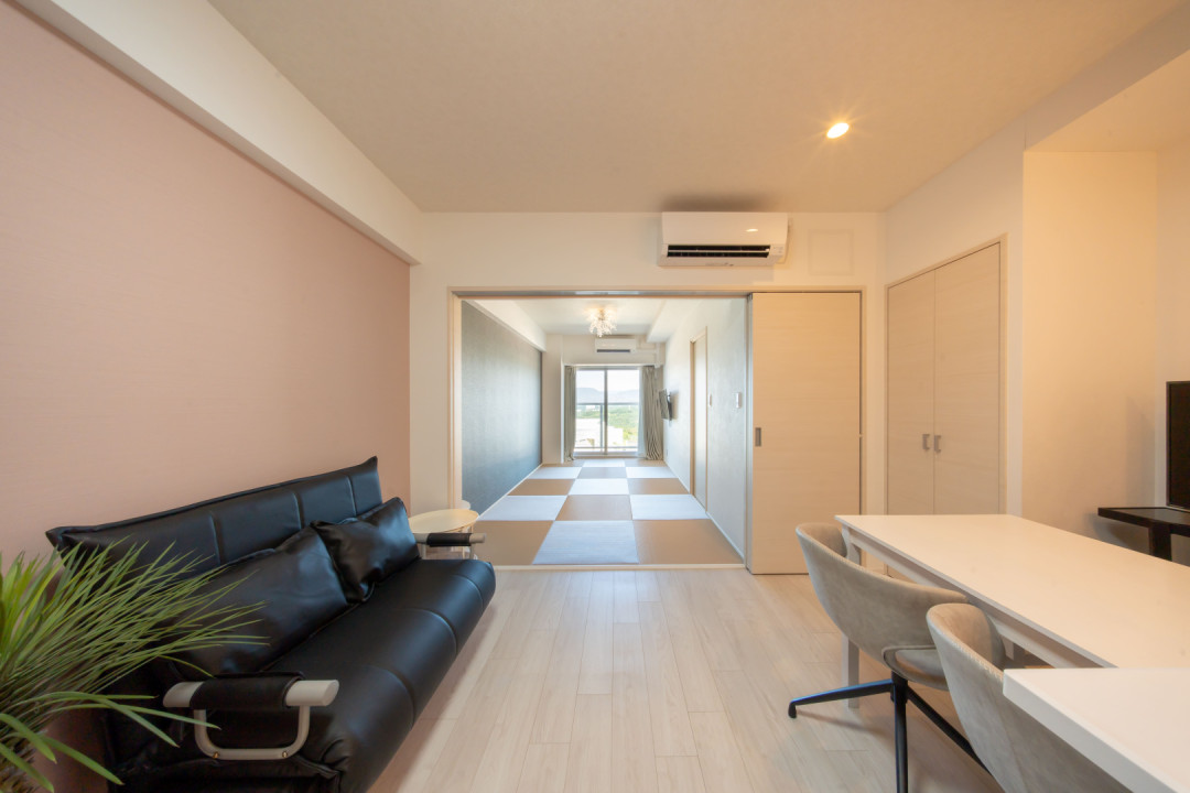 ■注意事項■ 掲載中の情報は、同タイプの他部屋のものです。 実際にお入居いただくお部屋とは間取りやインテリア、階数が異なる場合がございますので、予めご了承ください。 ■全室Wi-Fi完備 ■リビング リゾートの非日常感を満喫いただくために リビングは寛ぎを大切にした贅沢なインテリアデザインを採用しました。 ■キッチン システムキッチンがあり室内で調理ができます。 ■ベッドルーム 畳のお部屋で、温かみがあり和の空気を感じられます。 お布団を敷いてぐっすりお休みください。 (布団4組、ソファベッド1台) ■バスルーム、パウダールーム バスルームには、日本で大人気の話題のミラバスや ミラブルシャワーを設置。 超微細な気泡で毛穴レベルから綺麗にし、 疲れをほぐします。 ■洗濯機・浴室乾燥を完備 ■オプションサービス 《簡易部屋清掃》 2週間に1度、予め決められた日時に清掃サービスを行います。 提供内容は下記の通りです。 ・リネン交換(シーツ、タオル) ・室内清掃(キッチン、トイレ、パウダールーム、浴室、居住スペース) ※消耗品(シャンプーや洗剤、ティッシュ等)の補充はありません。 ※ご不在の場合でもお部屋に入らせていただきます。